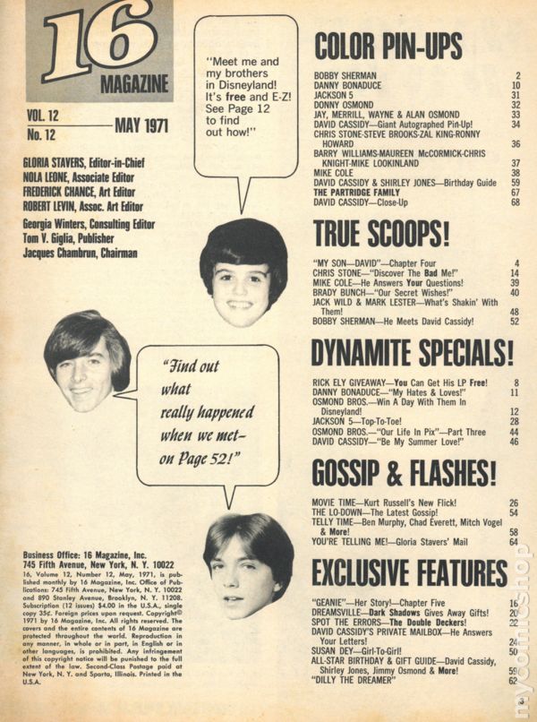 May 1971. Fan magazine aimed at teenage girls. Coverage of David Cassidy and The Partridge Family, The Osmonds, Bobby Sherman, and more. 8.25" x 11". 64 pages. Black and white with a few full-color pages. Cover price $0.35.
