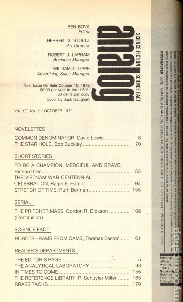 October 1972. Stories: "The Pritcher Mass" (conclusion) by Gordon R. Dickson, "Common Denominator" by David Lewis, "The Star Hole" by Bob Buckley, "To Be a Champion, Merciful and Brave" by Richard Olin, "The Vietnam War Centennial Celebration" by Ralph E. Hamil, and "Stretch of Time" by Ruth Berman. Science Fact article, "Robots--Rams From Cams" by Thomas Easton. Cover by Jack Gaughan. Illustrations by John Schoenherr, Jack Gaughan, Leo Summers, Vincent diFate, and Kelly Freas. 5.5-in. x 7.5-in.; black and white; 176 newsprint pages. Cover price $0.60.