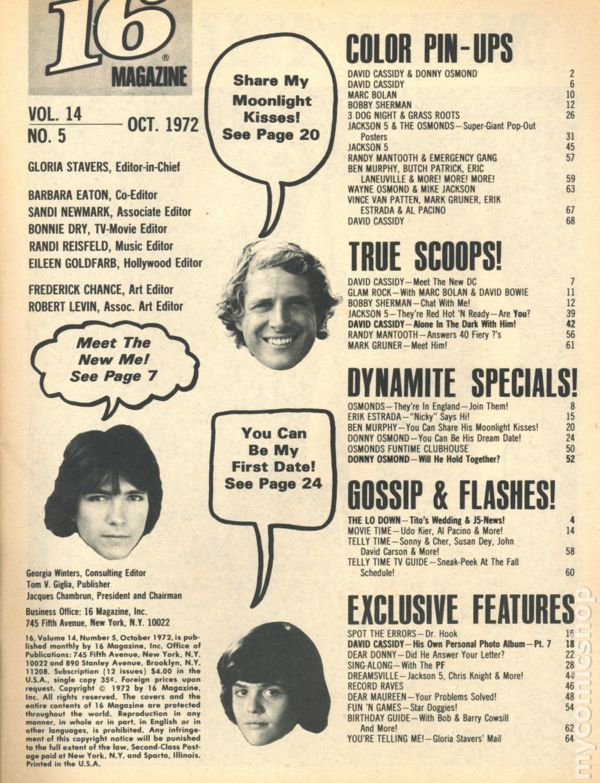 October 1972. Fan magazine aimed at teenage girls. Coverage of David Cassidy and The Partridge Family, The Osmonds, Bobby Sherman, and more. 8.25" x 11". 66 pages. Black and white with a pull-out full-color poster, Osmonds on one side, Jackson 5 on the other. Cover price $0.35.