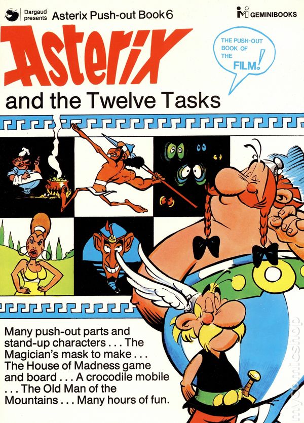 Asterix and the Twelve Tasks. Text by Anthea Bell. Color art and games by John Grace and Sam Thompson. Push-out book with character stand ups and pieces to make "The Magician's mask", "The House of Madness" game and board, a crocodile mobile, and "The Old Man of the Mountains. 9" x 12-1/4", 28 pages, PC/PB&W.