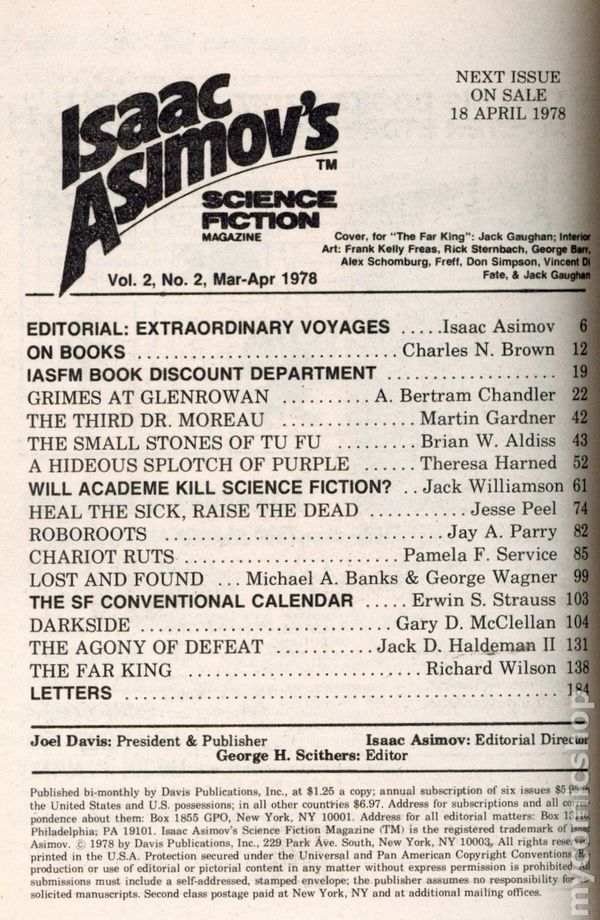 March 1978. Cover by Paul Lehr. Stories: "The Outcasts of Heaven Belt"(part 2) by Joan D. Vinge, "Moontrack" by George W. Olney, "The Broken Dome" by Vonda N. McIntyre, "Too Much at Steak" by Gary D. Douglass, and "To Keep and Bear Arms" by Larry Matthews. Science Fact article: "The Disposal of Nuclear Waste in Space: Will It Ever Be Feasible?" by Michael McCollum. Special feature: "Science Fiction Crossword Puzzle" by Felix Polz. Illustrations by Paul Lehr, Vincent Di Fate, Mike Hinge, Jack Gaughan, and Janet Aulisio. Softcover, 5.5-in. x 7.5-in.; 178 newsprint pages, B&W. Cover price $1.25.