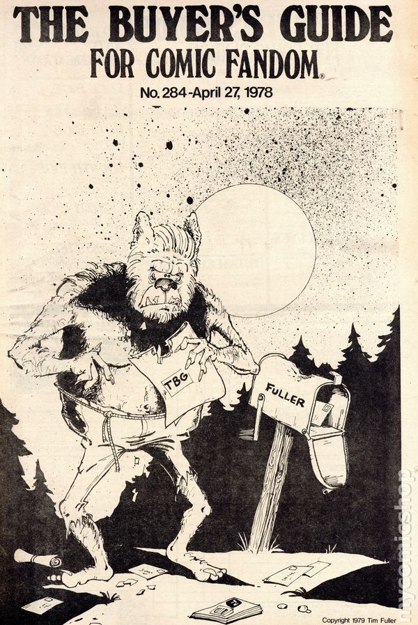 The Buyers Guide for Comic Fandom #284, April 27, 1979. This issue has three sections, 72 pages, and includes an extra two-section, tabloid-sized, 28-page American Comic Book Company catalog, Book and Magazine List 1979. Inside, the issue features a Dateline comic strip by Fred Hembeck. The werewolf cover was drawn by Tim Fuller. NOTE: The cover for this issue is incorrectly dated "1978." It was actually published in 1979.
