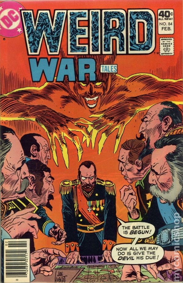 Cover art by Joe Kubert. One page of art by Romeo Tanghal. Devil's Due, script by George Kashdan, art by Ernesto Patricio; set in 1917 in Russia. The Peacemaker, script by Mike W. Barr, pencils by Charles Nicholas, inks by John Celardo; set weeks after D-Day in Hume, France during World War II. The Once and Future War, script by Paul Kupperberg, art by Jose Matucenio; set in the British Isles in the 5th century A.D., as well as during World War II. 36 pgs. $0.40. Cover price $0.40.