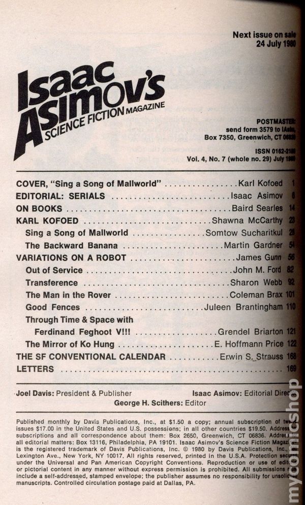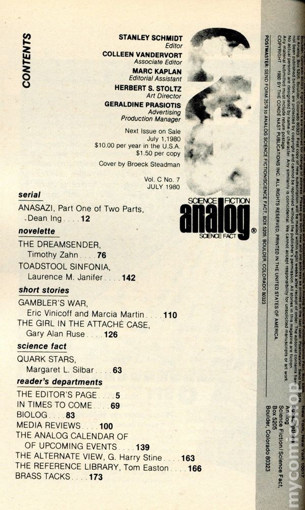 July 1980. Cover by Broeck Steadman. Stories: "Anasazi"(Part 1) by Dean Ing, "The Dreamsender" by Timothy Zahn, "Toadstool Sinfonia" by Laurence M. Janifer, "Gambler's War" by Eric Vinicoff and Marcia Martin, and "The Girl in the Attache Case" by Gary Alan Ruse. Science Fact article: "Quark Stars" by Margaret L. Silbar. Softcover, 5.25-in. x 7.5-in.; 178 newsprint pages, B&W. Cover price $1.50.