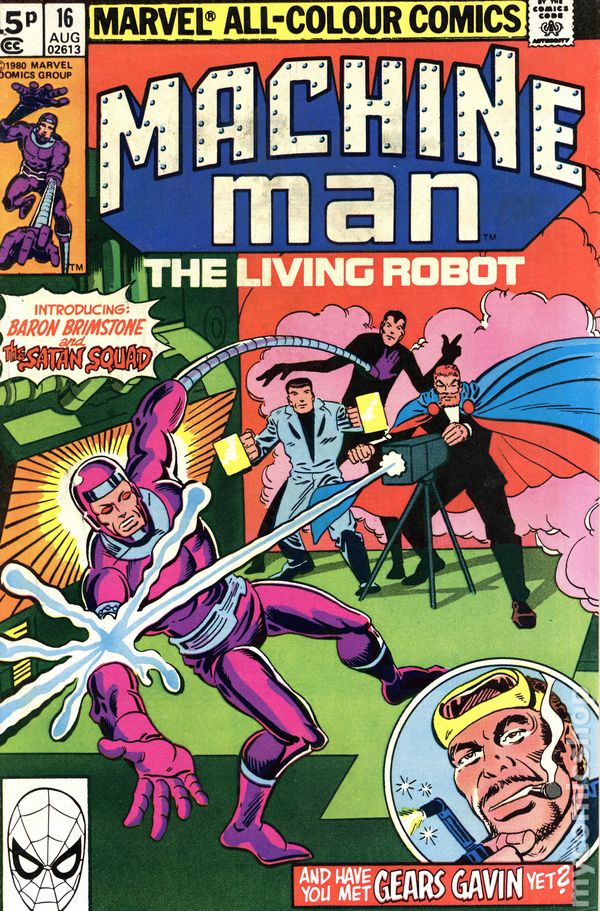 UK edition. Identical to US edition, but has 15p cover price. Written by Tom DeFalco. Art and Cover by Steve Ditko. Introducing...Baron Brimstone and the Satan Squad! And have you met Gears Garvin yet? Starring Machine Man, Baron Brimstone (introduction), Satan Squad [Hammer Harrison (introduction), Snake Marston (introduction)], Duke Dawson, Gears Garvin, Maggie Jones, Pamela Quinn and Eddie Harris. Plus: Letters page includes Ditko's unpublished cover to issue #10. 6.75" x 10.25", 32 pages, FC.