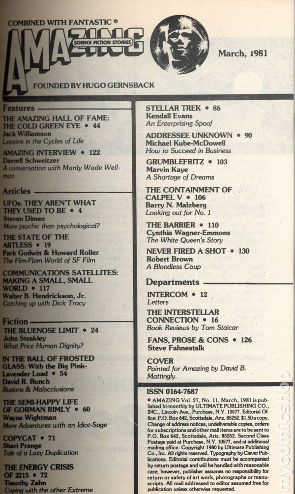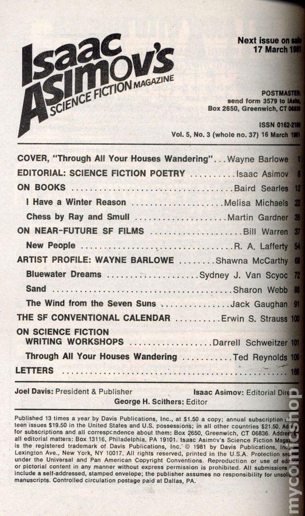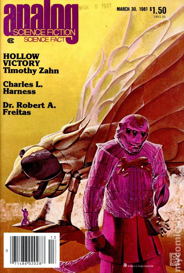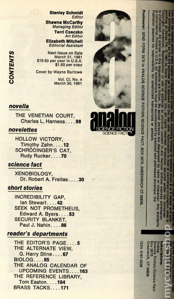 March 1981. Cover by Wayne Barlowe. Stories: "The Venetian Court" by Charles L. Harness, "Hollow Victory" by Timothy Zahn, "Schrodinger's Cat" by Rudy Rucker, "Incredibility Gap" by Ian Stewart, "Seek Not Prometheus" by Edward A. Byers, and "Security Blanket" by Paul J. Nahin. Science Fact article: "Xenobiology" by Dr. Robert A. Freitas. Softcover, 5.25-in. x 7.5-in.; 178 newsprint pages, B&W. Cover price $1.50.