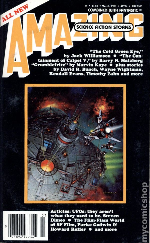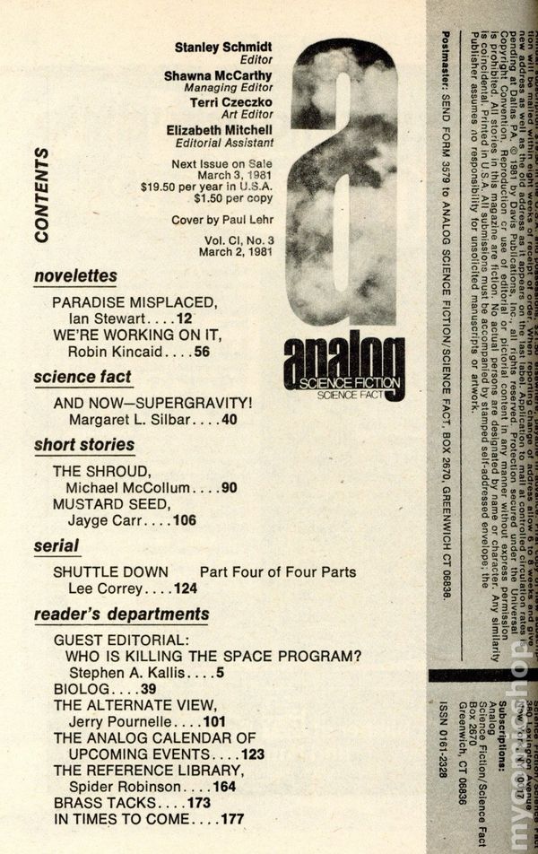 March 1981. Cover by Paul Lehr. Stories: "Shuttle Down"(Conclusion) by Lee Correy, "Paradise Misplaced" by Ian Stewart, "We're Working on it" by Robin Kincaid, "The Shroud" by Michael McCollum, and "Mustard Seed" by Jayge Carr. Science Fact article: "And Now-Supergravity!" by Margaret L. Silbar. Softcover, 5.25-in. x 7.5-in.; 178 newsprint pages, B&W. Cover price $1.50.