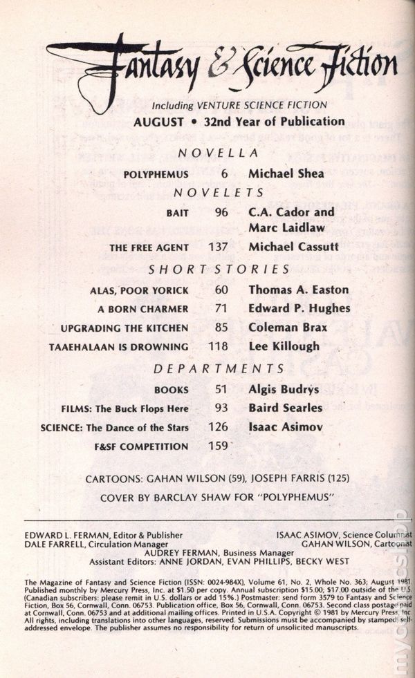 Volume 61, Issue 2 - August 1981. Cover by Barclay Shaw. Fantasy and Science Fiction stories by Michael Shea, C.A. Cador, Marc Laidlaw, Michael Cassutt, Thomas A. Easton, Edward P. Hughes, Coleman Brax, Lee Killough. Science article by Isaac Asimov. Softcover. 5-in. x 7-in., 160 pages, Text (with B&W illustrations). Cover price $1.50.