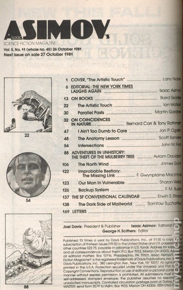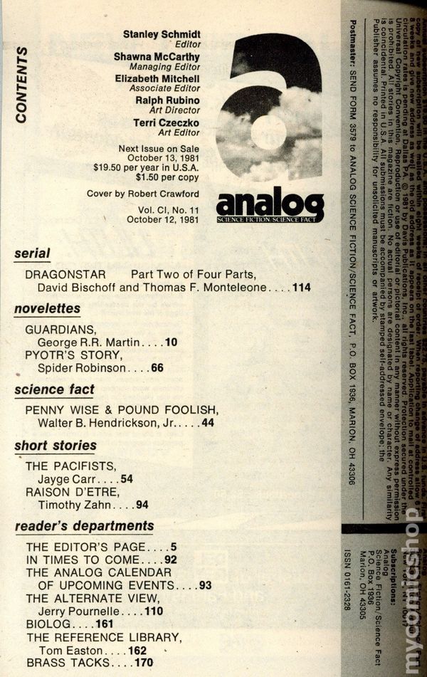 October 1981. Cover by Robert Crawford. Stories: "Dragonstar"(Part 2) by David Bischoff and Thomas F. Monteleone, "Guardians" by George R. R. Martin, "Pyotr's Story" by Spider Robinson, "The Pacifists" by Jayge Carr, and "Raison D'Etre" by Timothy Zahn. Science Fact article: "Penny Wise and Pound Foolish" by Walter B. Hendrickson, Jr. Softcover, 5.25-in. x 7.5-in.; 178 newsprint pages, B&W. Cover price $1.50.