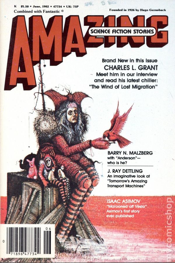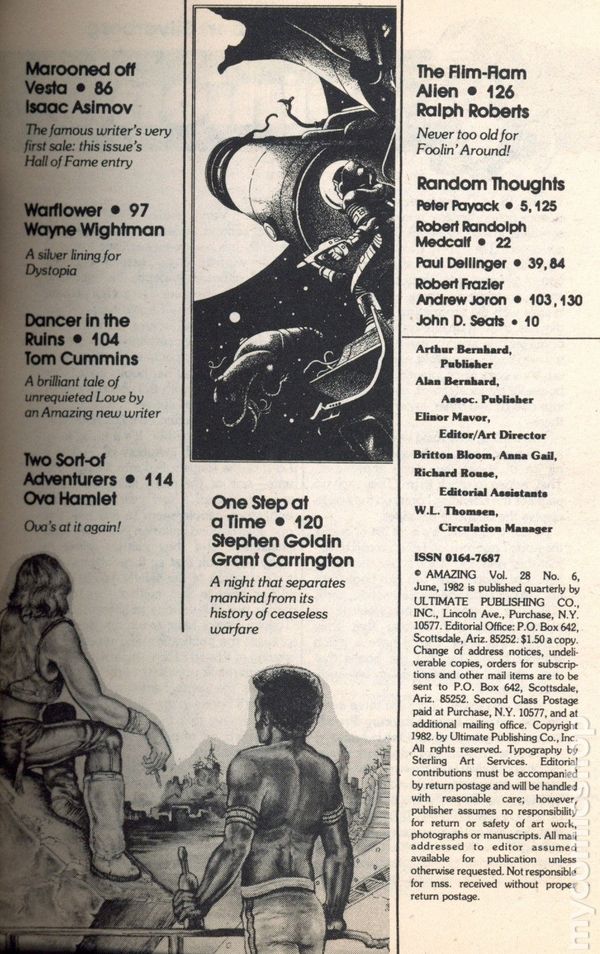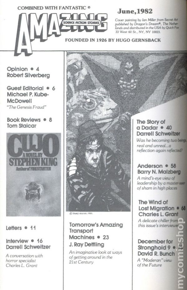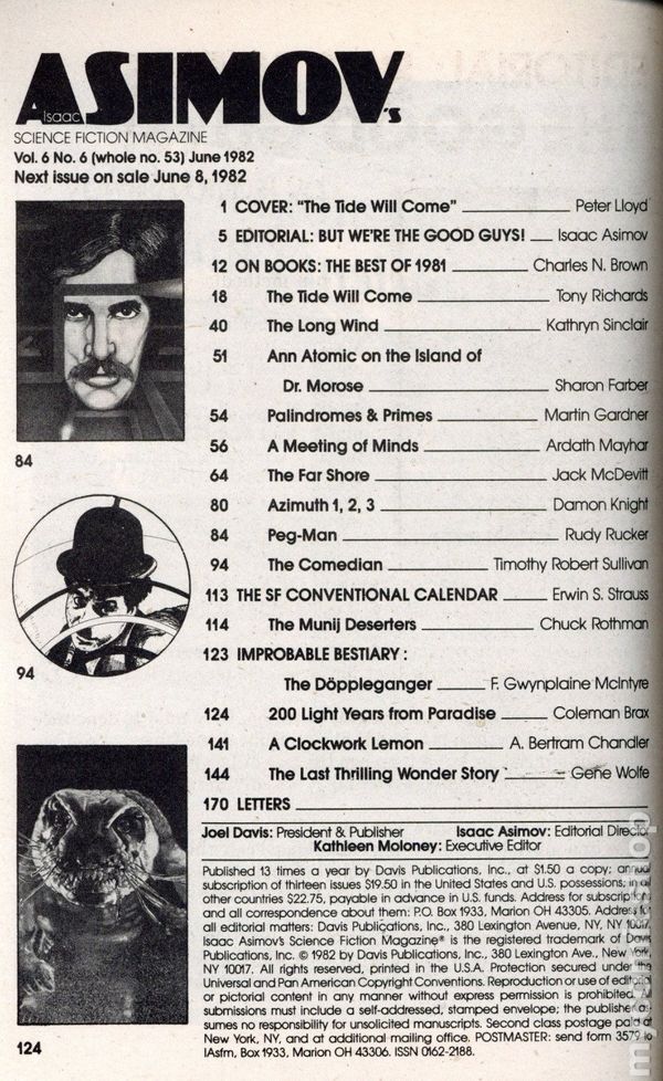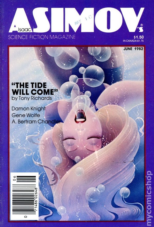 June 1982. Stories: "Brainchild" by Joseph H. Delaney, "Too Loving a Touch" by Marc Stiegler, "The Garden of the Cognoscenti" by Michael P. Kube-McDowell, "Melancholy Elephants" by Spider Robinson, and "Reaction Time" by David Kyle. Science Fact article, "Alien Sex" by Dr. Robert A. Freitas Jr. Cover by James Odbert. Illustrations by Broeck Steadman and H.R. Van Dongen. Softcover, 5.5-in. x 7.5-in.; 178 newsprint pages, B&W. Cover price $1.50.