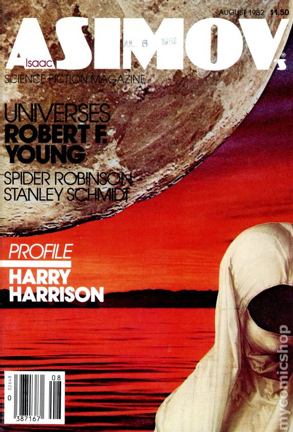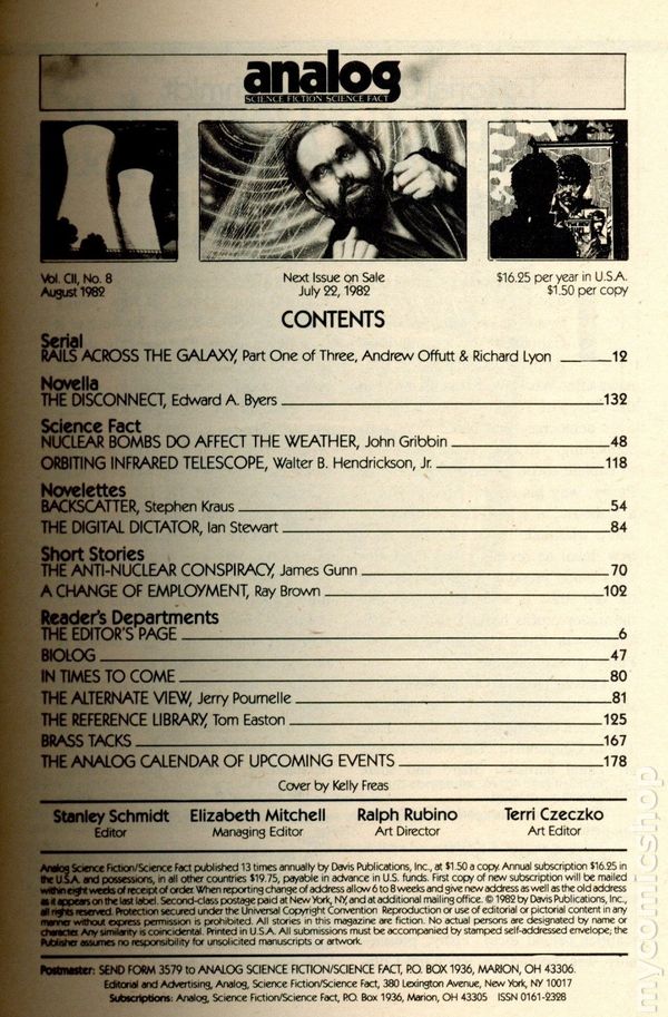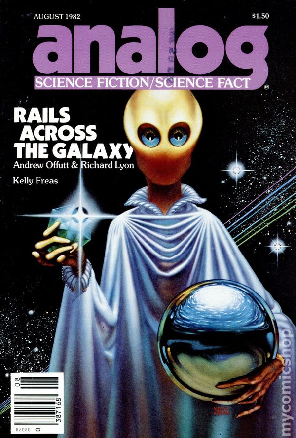 August 1982. Stories: "Rails Across the Galaxy" (part 1) by Andrew Offutt and Richard Lyon, "The Disconnect" by Edward A. Byers, "Backscatter" by Stephen Kraus, "The Digital Dictator" by Ian Stewart, "The Anti-Nuclear Conspiracy" by James Gunn, and "A Change of Employment" by Ray Brown. Science Fact articles, "Nuclear Bombs Do Affect the Weather" by John Gribbin and "Orbiting Infrared Telescope" by Walter B. Hendrickson Jr. Cover by Kelly Freas. Illustrations by Kelly Freas, Leo Summers, Bob McMahon, Jack Gaughan, Janet Aulisio, and Broeck Steadman. Softcover 5.5-in. x 7.5-in.; 178 newsprint pages, B&W. Cover price $1.50.