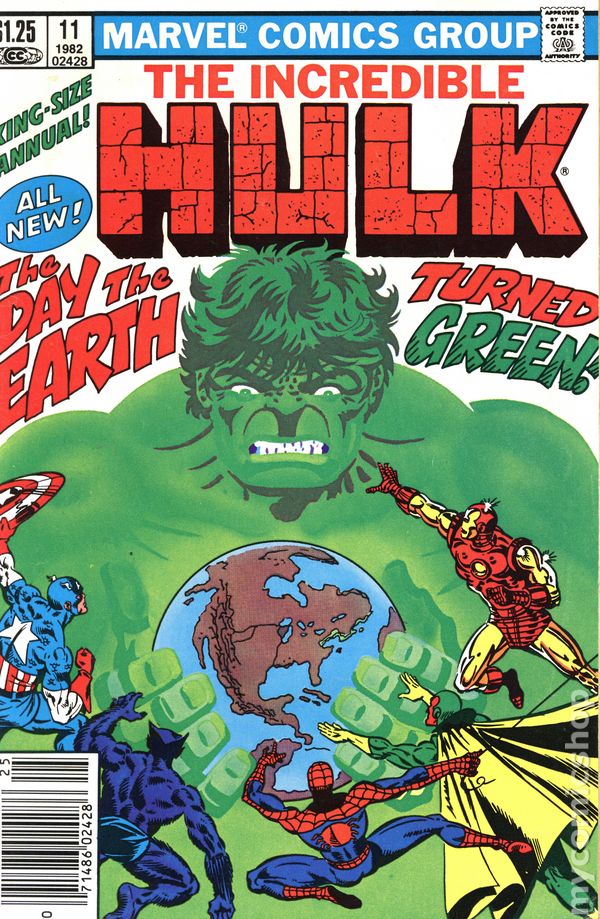 Canadian edition with $1.25 cover price. Cover by Al Milgrom. Stories by Bill Mantlo and Mary Jo Duffy. Art by Rich Buckler & Joe Sinnott and Frank Miller & Steve Mitchell. "The Day the Earth Turned Green" - The Leader has obtained a sample of Bruce Banner's gamma irradiated blood and used it to cause a "green flu" that is bringing down the inhabitants of New York City; with Spider-Man and the Avengers after him, Hulk uncovers the fact that the Leader has infected the city's water supply! "Unus Unchained" - In this back-up story, Doc Samson figures out a way to touch the untouchable Unus! 48 pages, full color. Cover price $1.25.