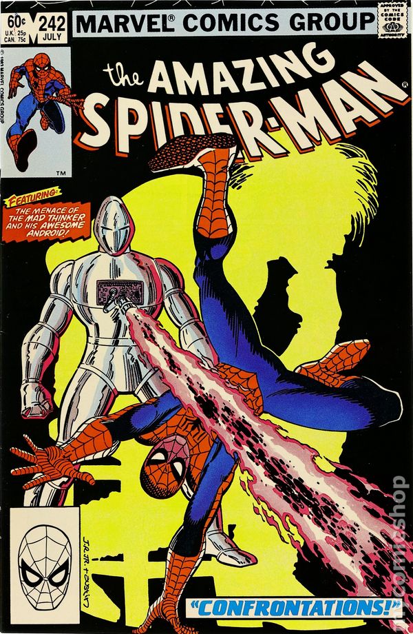 Direct Edition. "Confrontations!" Script by Roger Stern. Art by John Romita Jr. (breakdowns) and Kevin Dzuban (finishes). Cover by John Romita Jr. and Terry Austin. Many things weigh heavily on the mind of Peter Parker! His graduate studies, his personal finances, and the critical condition of the Black Cat! One day at a time Aunt May's nephew will try to solve his problems! Meanwhile in a prison cell in upstate New York, many things weigh heavily on the mind of the Mad Thinker! Specifically...what exactly is the web-slinger's "spider-sense" and how does it work? Per his typical modus operandi, the thinker sends an awesome android to investigate! And in precisely three hours, the awesome android makes contact with the Spectacular Spider-Man! Cameo appearance by Mary Jane Watson. Flashback cameos by the Avengers, Fantastic Four, and the original X-Men to recap the Mad Thinker's battles against them. (Note: Elements of the plot from Marvel Team-Up 129 continue in this issue.) 36 pages. Cover price $0.60.