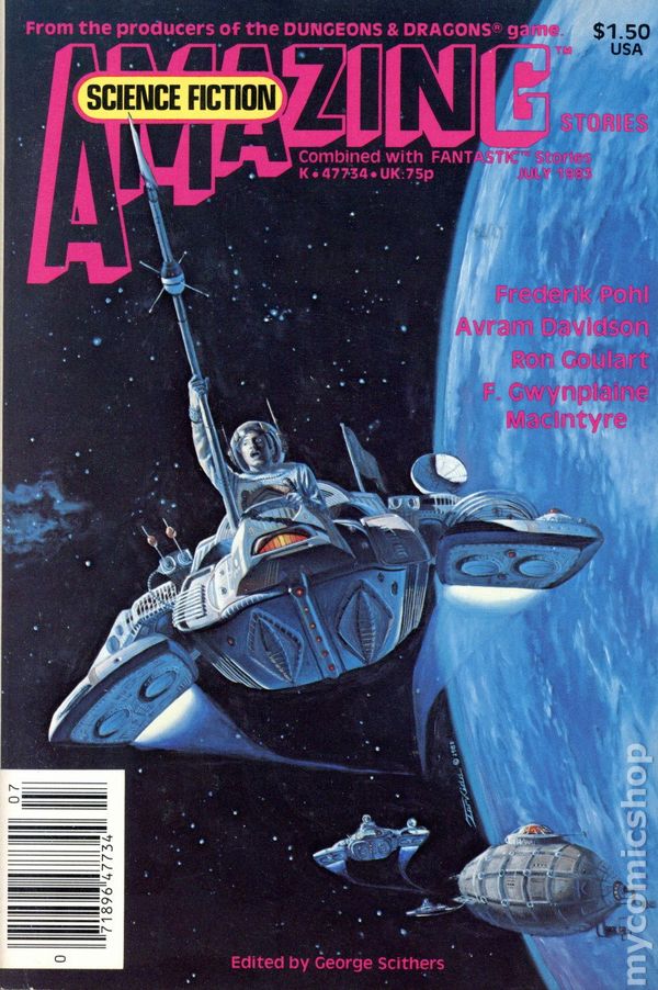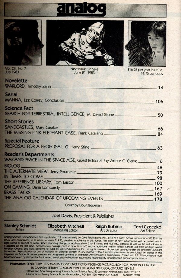 July 1983. Stories: "Manna" (conclusion) by Lee Correy, "Warlord" by Timothy Zahn, "Sandcastles" by Mary Caraker, and "The Missing Pink Elephant" by Frank Catalano. Science Fact article, "Search for Terrestrial Intelligence" by M. David Stone. Cover by Doug Beekman. Illustrations by Brad Hamann, Broack Steadman, Jack Gaughan, and Vincent Di Fate. Softcover, 5.5-in. x 7.5-in.; 178 newsprint pages, B&W. Cover price $1.75.