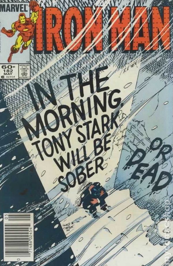 Newsstand Edition. "Deliverance" Script by Denny O'Neil. Pencils by Luke McDonnell. Inks by Steve Mitchell. Cover by Luke McDonnell and Steve Mitchell. Tony Stark is still living on the streets in a depressed state as a massive snowstorm bears down on the Big Apple! He should be seeking shelter, but instead he valiantly searches for a homeless pregnant woman he befriended a few weeks ago. Is there any chance of Tony, the woman, and her baby surviving the bitterly cold night outside? Last call has arrived for the once invincible iron man. Meanwhile in Central Park, Rhodey has returned from Battleworld with the Avengers! And he has new alien components installed on his armor! Cameo appearances by Morley Erwin, Captain America, Captain Marvel (aka Monica Rambeau), Hawkeye, and Thor. (Notes: Iron Man (aka Jim Rhodes)previously appeared in the final issue (#12) of the Marvel Super Heroes Secret Wars (1984) limited series. The letters page includes a statement of ownership: average print run 366,109; average paid circulation 187,564.) 32 pages. Cover price $0.60.