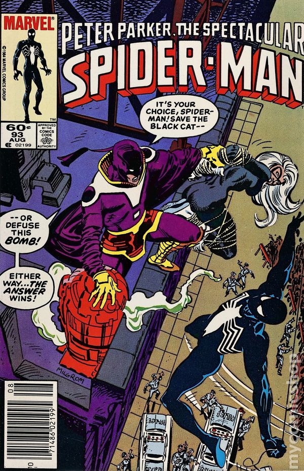 Newsstand Edition. "A Hot Time in the Old Morgue Tonight!" Script and Pencils by Al Milgrom. Inks by Jim Mooney. Cover by Al Milgrom. Spider-Man in black costume. The Kingpin calls in his first favor from Felicia after granting her bad luck powers four issues ago. The Black Cat participates in a fake bomb plot in order to keep the wall-crawler occupied, so the Answer can steal a body from the morgue! Why does the Kingpin want a corpse? Meanwhile, Peter Parker's doubts concerning his relationship with the Black Cat continue to grow. 32 pages Cover price $0.60.