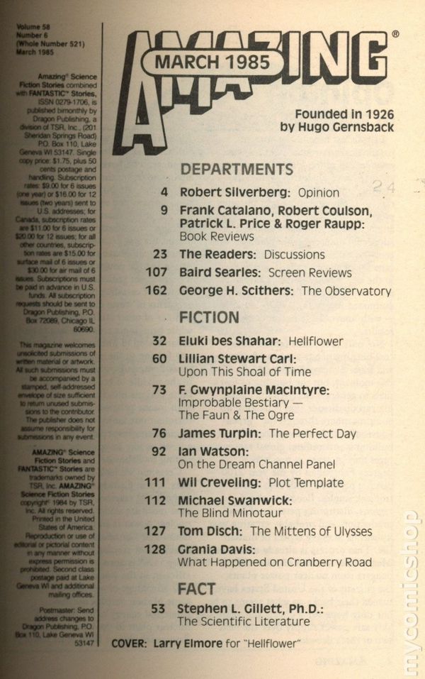 March 1985. Cover by Vincent Di Fate. Stories: "Between the Strokes of Night" (part 1) by Charles Sheffield, "Field Trial" by W.R. Thompson, "Don't Get Around Much Anymore" by Ray Brown, "Art Appreciation" by P.M. Fergusson, "Patera Crossing" by Kenneth W. Ledbetter, "The Lords of Creation" by Edward Llewellyn, and "Programmed for Destruction" by John Gribbin. Science Fact article, "Hot Rocks and Water" by G.F.R. Ellis and Tony Rothman. Illustrations by Vincent Di Fate, Jack Gaughan, Doug Beekman, Val Lakey Lindahn, H.R. Van Dongen, Doug Chaffee. Softcover, 5.5-in. x 7.5-in.; 194 newsprint pages, B&W. Cover price $2.00.