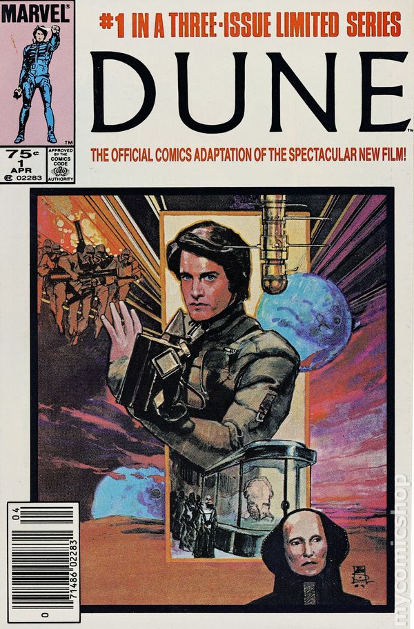 Newsstand Edition. Reprinted from Marvel Comics Super Special 36. Comic adaptation of the 1984 David Lynch movie starring Kyle MacLachlan. In this issue, it's the year 10,191 and the most precious substance is the spice which is vital for almost everything and exists on only one planet in the universe: a desolate and dry world of deserts, the planet Arrakis, also known as Dune. And on the planet, Paul Atreides is undergoing training and tests as he learns about the planet and the people. Script by Ralph Maccho and art by Bill Sienkiewicz. Cover price $0.75.