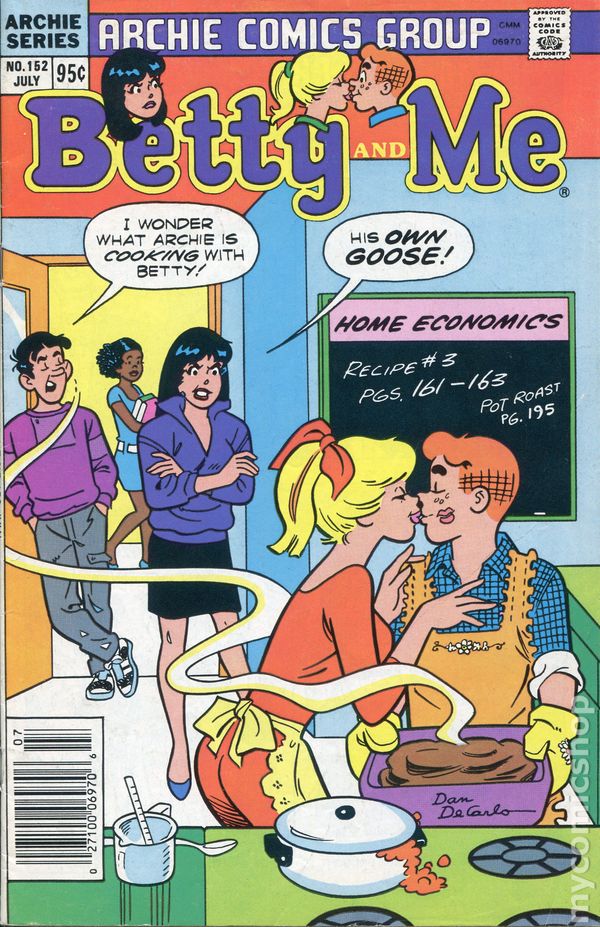 Canadian Price Variant. First 95¢ cover price. Cover pencils by Dan DeCarlo. Anti-smoking ad from Archie Comics and the American Cancer Society, art by Dan DeCarlo. "Scheme Theme," script by George Gladir, pencils by Stan Goldberg, inks by Rudy Lapick; Jughead comes up with a plan to get Archie to stop taking Betty for granted. Camera Bug Word Find activity page by Rod Ollerenshaw. Betty Cooper models music themed hairstyles submitted by readers, pencils by Kathleen Webb, inks by Dan DeCarlo. "TV Spree," script by George Gladir, pencils by Stan Goldberg, inks by Rudy Lapick; Betty bets Veronica that she can spend a day with Archie without him watching television. "Thoughts," script by Jim Ruth, pencils by Stan Goldberg, inks by Rudy Lapick; Betty wants to be romantic with Archie, but all he can think about is baseball. "No Comparison," script by George Gladir, pencils by Stan Goldberg, inks by Rudy Lapick; At an electronics trade show, Archie tries to decide whether Betty or a robot would make a better tutor. 36 pages, full color. Cover price $0.95.