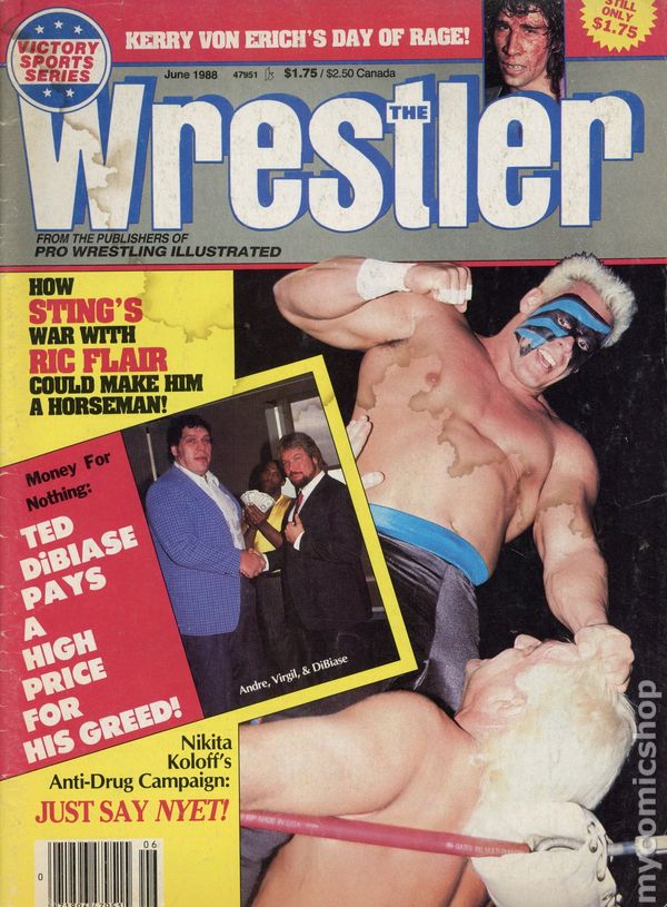 June 1988. Sting vs Ric Flair cover. Magazine centered around Professional Wrestling. 8" x 10.75", 66 pages, B&W. Cover price $1.75.