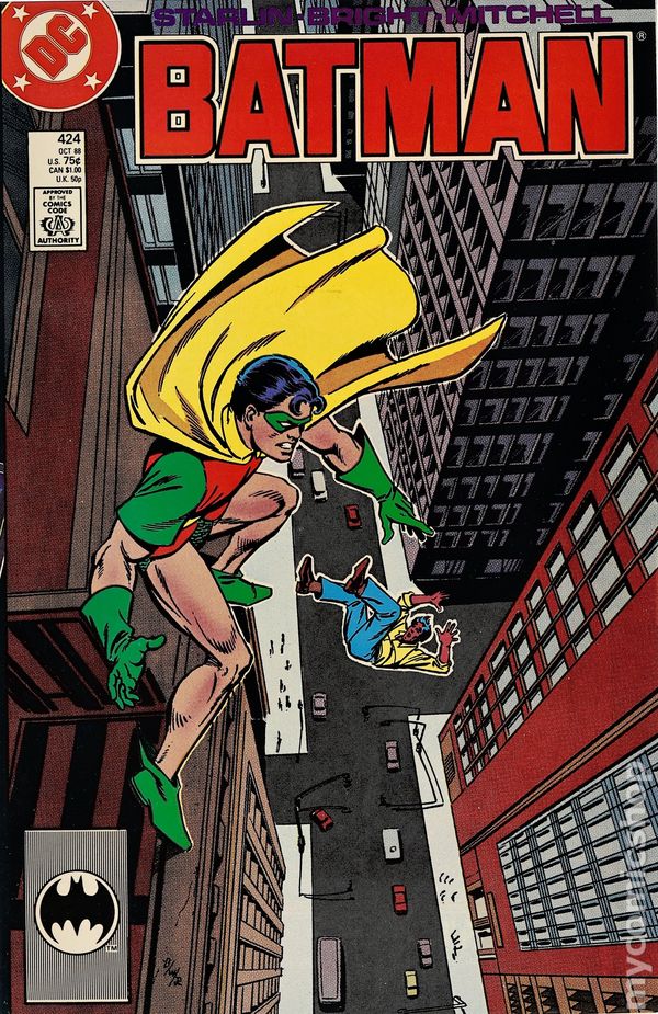 1st printing. Direct Edition. Robin vows to take down Felipe Garzonas for his crimes, no matter the cost, in "The Diplomat's Son". Part 1 of 2, continued next issue. Script by Jim Starlin, pencils by Mark Bright, inks by Steve Mitchell. 1st printing. NOTE: Most issues from 397-432 were reprinted in 1989 and sold in multipacks. These 2nd and 3rd prints have back cover ads dated 1989. 36 Pages, Full Color. Cover price $0.75.