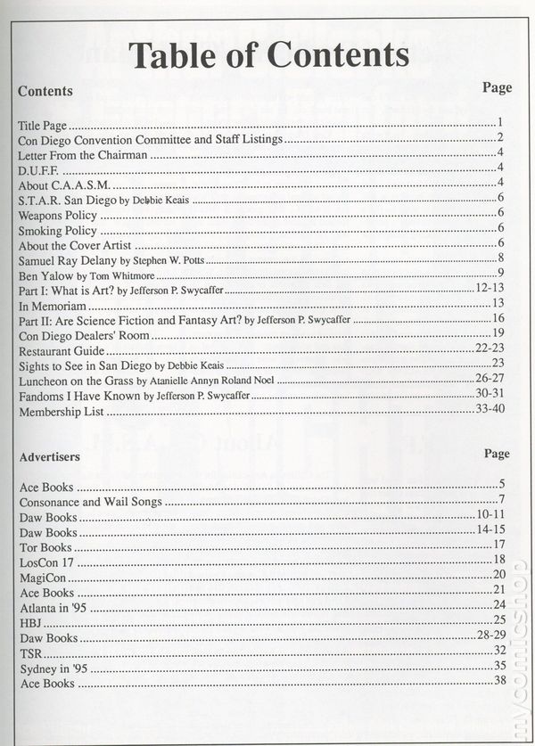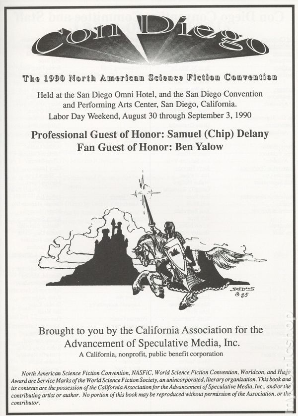 Con Diego is the North American Science Fiction Convention held on 1990 in San Diego. The California Association for the Advancement of Speculative Media (CAASM) created this booklet for the convention. 8.5" x 11", 40 pages, B&W.