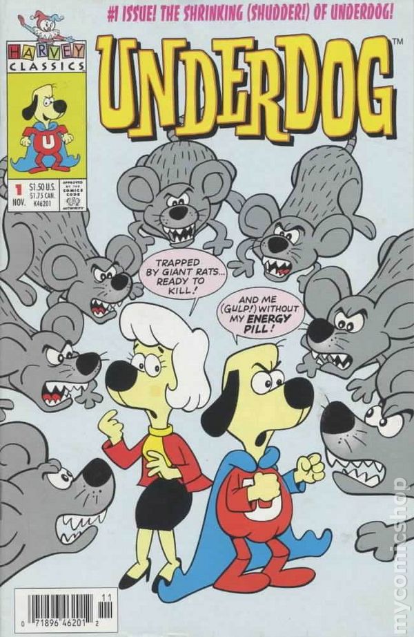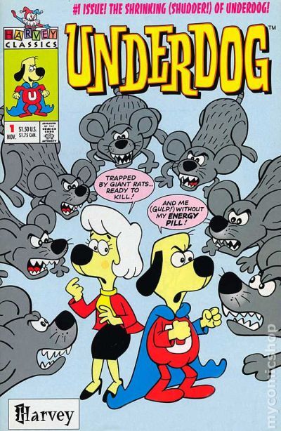 Direct Edition. The Big Shrink! Stories and art by Frank Johnson and others. The dog of steel returns to comics as part of Harvey Comics' revival in the early 1990s. Simon Bar Sinister's latest scheme involves a formula that will shrink the entire world, so that he can be the tallest man alive. But Underdog won't let him stoop to that level. 32 pages, Full Color. Cover price $1.50.