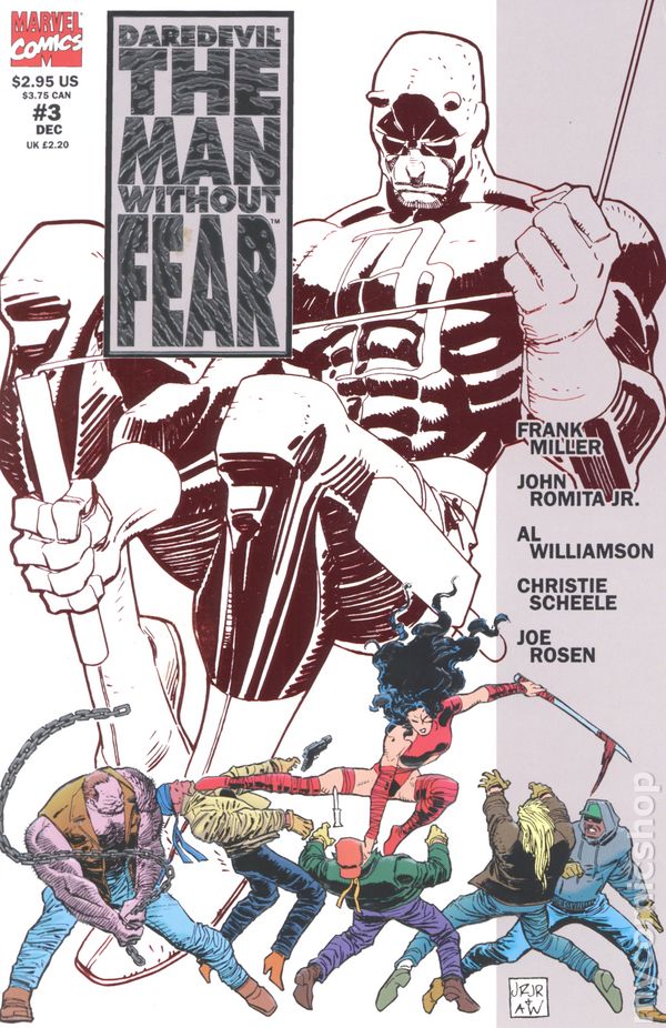 Matt's passion for Elektra blinds him (no pun intended) to the truth about her, Elektra's bloodlust has her take on 5 thugs alone, and Stick has a warning for Matt. Part 3 of 5. Script by Frank Miller, pencils by John Romita Jr., inks by Al Williamson. Romita Jr./Williamson cover. Red foil and embossed cover. Cover price $2.95.