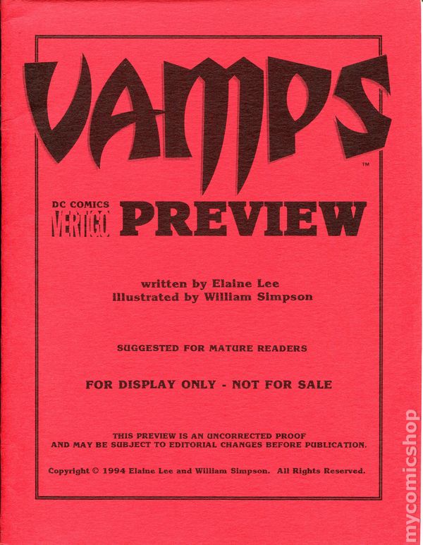 Retailer Preview. Story by Elaine Lee. Art by William Simpson. These booklets were sent to retailers to help promote the upcoming series. Uncorrected proof of the first 24 pages of Vamps (1994) #1. Saddle stitched. 8 1/2" X 11". B&W. 32 pages.
