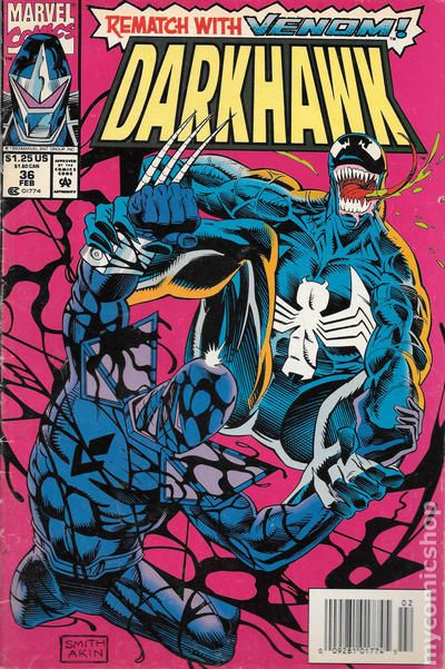 Newsstand Edition. Cover pencils by Tod Smith, inks by Ian Akin. Operation: Symbiote Part Two: Seek & Hide starring Darkhawk, Venom, the Seekers, Mike Powell, Philippe Bazin, St. Johnny, Ned, Jon, and Jason, script by Danny Fingeroth, pencils by Tod Smith, inks by Ian Akin; Darkhawk and Venom battle the Seekers. 36 pgs. $1.25. Cover price $1.25.