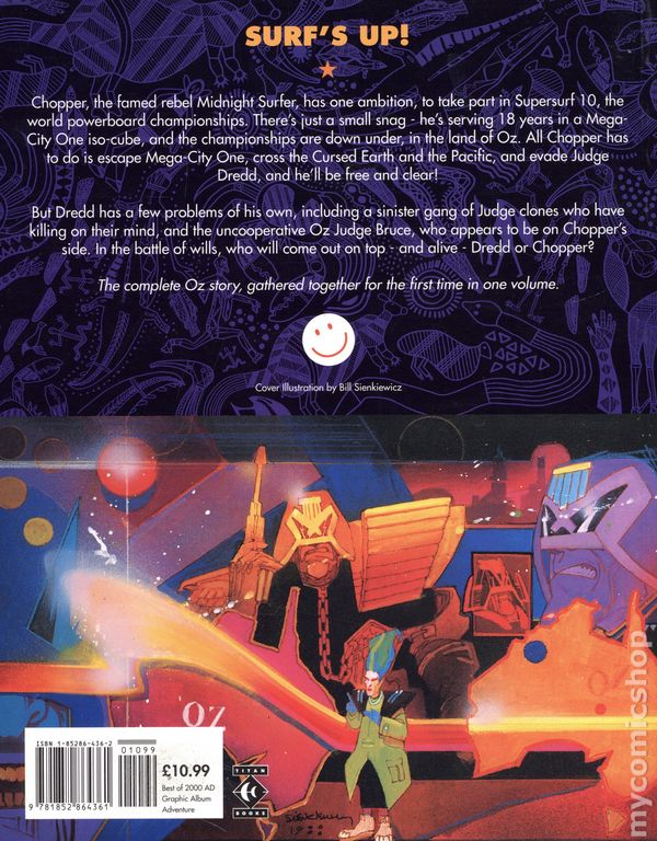 1st Printing. Written by John Wagner and Alan Grant. Art by Cliff Robinson, Steve Dillon, Will Simpson, Jim Baikie, Brendan McCarthy, Paul Behrer, Dave Elliot, John Higgins, and Barry Kitson. Cover by Bill Sienkiewicz. Chopper, the famed rebel Midnight Surfer, has one ambition, to take part in Supersurf 10, the world powerboard championships! There's just a small snag - he's serving 18 years in a Mega-City One iso-cube, and the championships are down under, in the land of Oz! All Chopper has to do is escape Mega-City One, cross the Cursed Earth, and teh Pacific, and evade Judge Dredd, and he'll be free and clear! Dredd has a few problems of his own, including a sinister gang of Judge clones who have killing on their mind, and the uncooperative Oz Judge Bruce, who appears to be on Chopper's side. in a battle of wills, who will come out on tope - and alive - Dredd, or Chopper?!? Softcover, 8 1/2-in.x 11-in., 240 pages, B&W.