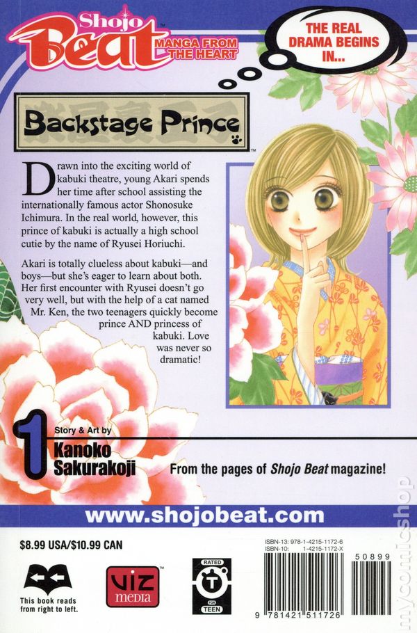 Volume 1 - 1st printing. Story and art by Kanoko Sakurakoji. Translated and Adapted by Mai Ihara. Drawn into the world of kabuki theatre, young Akari spends her time after school assisting the actor Shonosuke Ichimura, who's actually a high school cutie by the name of Ryusei Horiuchi. Akari is totally clueless about kabuki and boys, but she's eager to learn about both. Her first encounter with Ryusei doesn't go very well, but with the help of a cat named Mr. Ken, the two teenagers quickly become prince AND princess of kabuki. Love was never so dramatic! Softcover, 5-in. x 7-in., 192 pages, B&W. Teen Cover price $8.99.