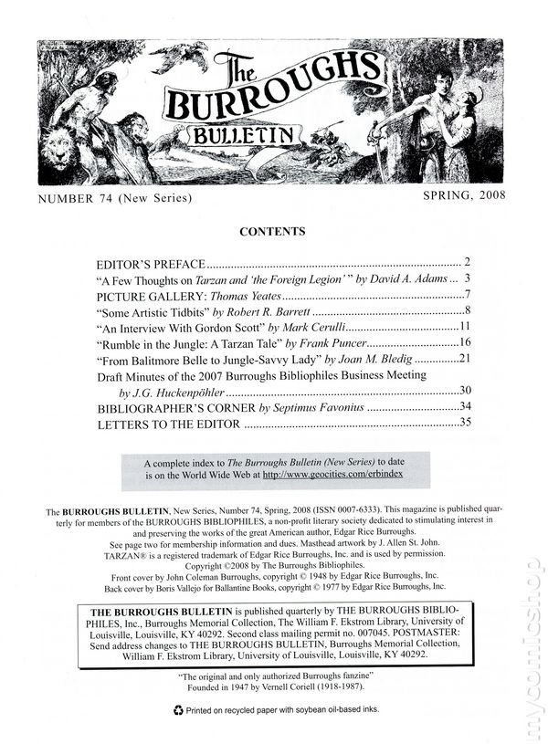 Issue #74 - Spring 2008. Fanzine published for the benefit of the Burroughs Bibliophiles. Interview with Gordon Scott, "A Few Thoughts on Tarzan and the Foreign Legion" by David Adams. 8 1/2-in. x 11-in. 36 Pages plus insert on Death of Danton Burroughs B&W. Cover price $7.00.