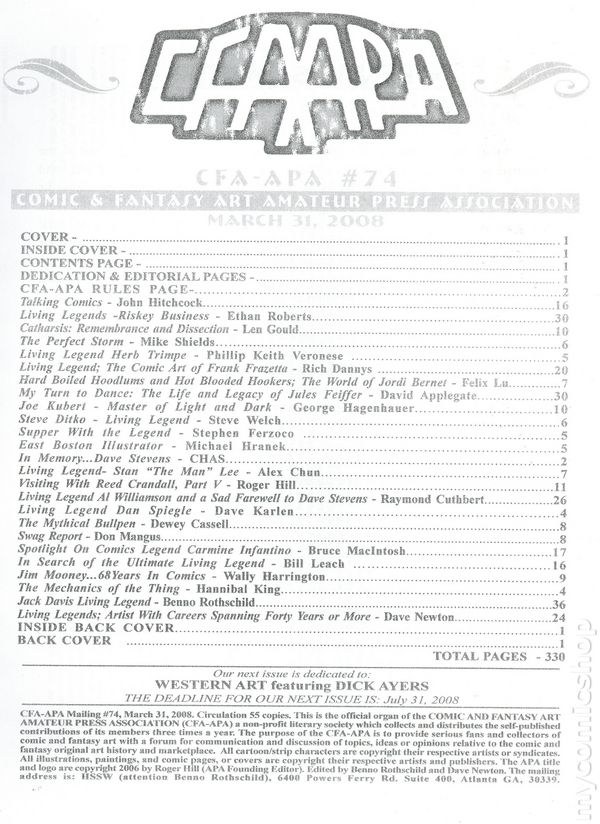 Issue 74 - March 31, 2008. Founded in 1985 by Roger Hill of Squa Tront fanzine fame, the Comic and Fantasy Art Amateur Press Association is a knowledgeable fan group which initially consisted of just 17 members. Circulation of 55 copies. Jack Davis cover. 8 1/2" x 11", 330 pages, PC/PB&W.