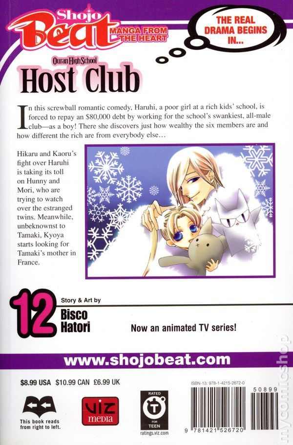 Volume 12 - 1st prinitng. Story and art by Bisco Hatori. Hikaru and Kaoru's fight over Haruhi is taking its toll on Hunny and Mori, who are trying to watch over the estranged twins. Softcover, 5-in. x 7-in., 184 pages, B&W. NOTE: These are Japanese manga-style GNs and are meant to be read right-to-left. Cover price $8.99.