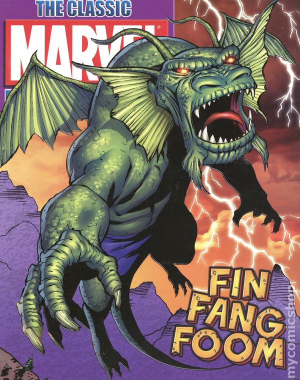 Mega Special #3: Fin Fang Foom - NOTE: Does NOT Include Figurine. Although once believed to be a native of the Valley of the Sleeping Dragon in China, Fin Fang Foom - whose name, roughly translated, means "He Whose Limbs Shatter Mountains and Whose Back Scrapes the Sun" - is actually a Makluan, a shape-shifting alien being from the world of Kakaranthara, awakened from his centuries-long slumber to ravage and conquer the land. First appearing in Strange Tales #89 (Oct. 1961), Foom has faced heroes ranging from the Fantastic Four to Iron Man, and remains a monstrous menace to this day. This special edition of Classic Marvel Figurine Collection Magazine features a huge, hand-crafted figure accompanied by an all-you-need-to-know magazine on Fin Fang Foom. Slick card-stock cover, 20 pages, 8 1/2-in. x 11-in., full color.