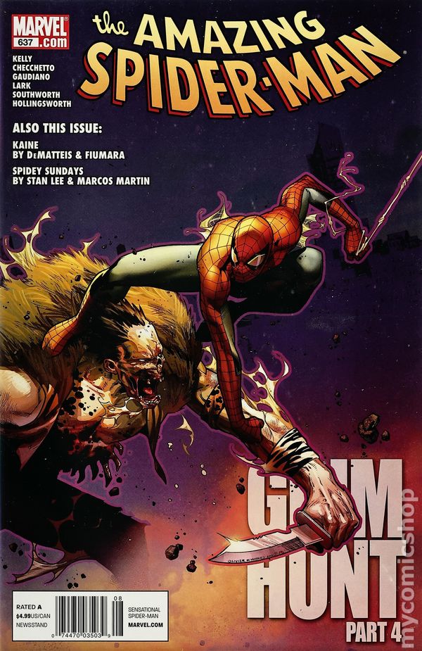 Newsstand Edition. Cover by OLIVIER COIPEL. Grim Hunt: Part 4 of 4 - Written by JOE KELLY, J.M DEMATTEIS and STAN LEE. Art by MARCO CHECCHETTO, MICHAEL LARK, STEFANO GAUDIANO, MATT SOUTHWORTH, MARCOS MARTIN, MAX FIUMARA and BRIAN THIES. THE LAST STAND OF THE KRAVENS! The Grim Hunt ends with a death in the family...but not the family you may think! Spider-Man's about to learn a violent lesson... that nothing is forever. Plus, more on the untold confrontation between Kraven and Kaine and the amazing 'Spidey Sunday Feature'! 52 Pages, full color. Cover price $4.99.