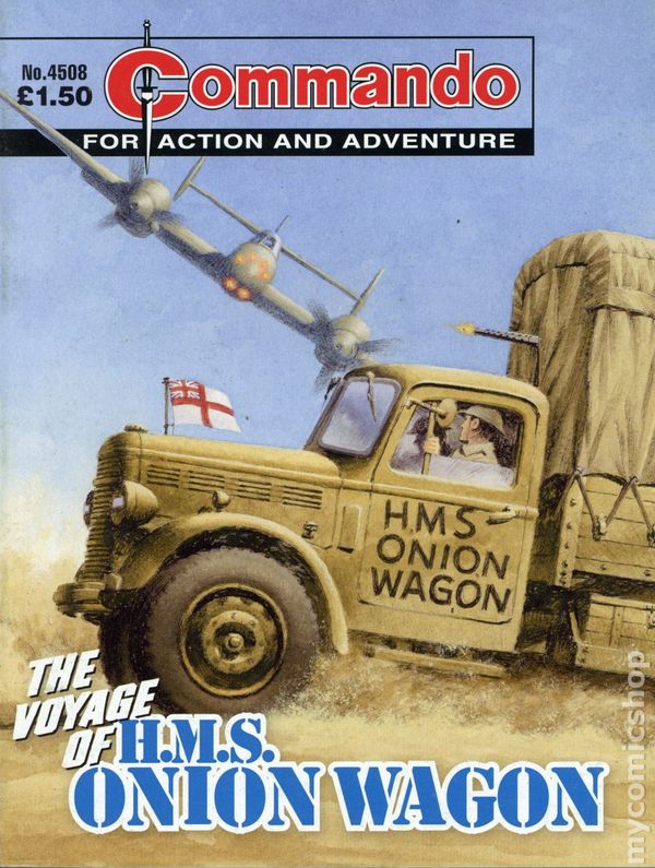The Voyage of H.M.S. Onion Wagon - Written by Peter Grehan. Art by Vila. Cover by Ian Kennedy. How did a motley crew of British and New Zealand sailors end up on a British Army Bedford lorry in the desert? How did a routine operation so very quickly go wrong and become an unexpected voyage into danger? Hop aboard H.M.S. Onion Wagon and find out! Weekly British War comics digest. Softcover, 5 1/2-in. x 6 1/2-in., 68 pages, B&W.