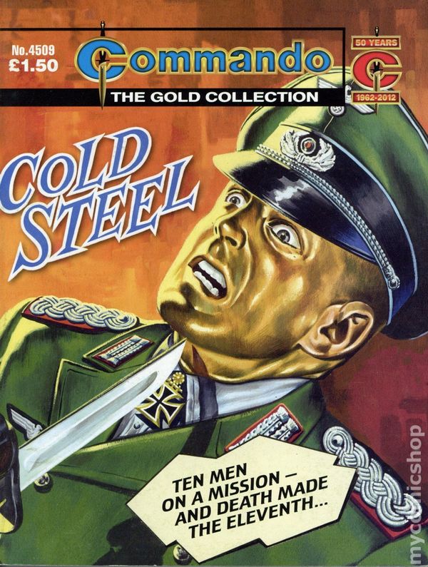 Reprinting Commando War Stories in Pictures (1961 D. C. Thomson Digest) #22: Cold Steel - Written by Jim Kenner. Art by Gordon Livingstone. Cover by Ken Barr. Armed to the teeth, they slipped and slithered from the hull of a submarine into a wave-battered rubber dinghy. A grim cargo of trouble on a life-or-death mission. Ten desperate men who were destined to become...ten dauntless heroes. Weekly British War comics digest. Softcover, 5 1/2-in. x 6 1/2-in., 68 pages, B&W.