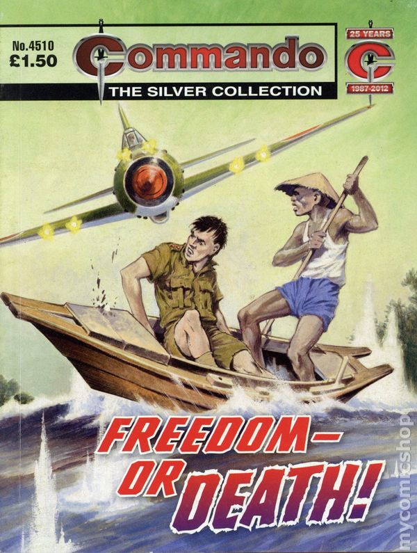 Reprinting Commando War Stories in Pictures (1961 D. C. Thomson Digest) #2062: Freedom - or Death! - Written by Bill Fear. Art by Keith Shone. Cover by Jeff Bevan. To a Gurkha soldier, honour is all important, and young Lal had a very important debt of honour to settle with his officer, Lieutenant Archie Cameron. So when the two men were captured by the enemy and sent to different POW camps, Lal was determined to free Archie. There was only one snag, though -- first he had to get free himself! Weekly British War comics digest. Softcover, 5 1/2-in. x 6 1/2-in., 68 pages, B&W.