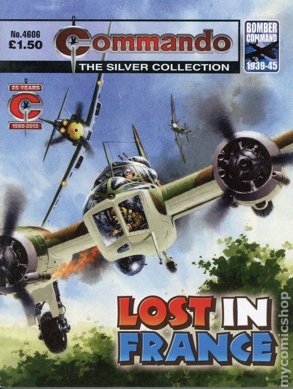 Reprinting Commando War Stories in Pictures (1961 D. C. Thomson Digest) #2162: Lost in France - Written by Allan Chalmers. Art by Josep Nebot. Cover by Ian Kennedy. Crash-landing a burning Blenheim bomber in occupied France would generally be reckoned pretty dangerous. And so it was, but compared to what fate still had in store for Harry Conway and his crew, that crash was a picnic! Weekly British War comics digest. Softcover, 5 1/2-in. x 6 1/2-in., 68 pages, B&W.