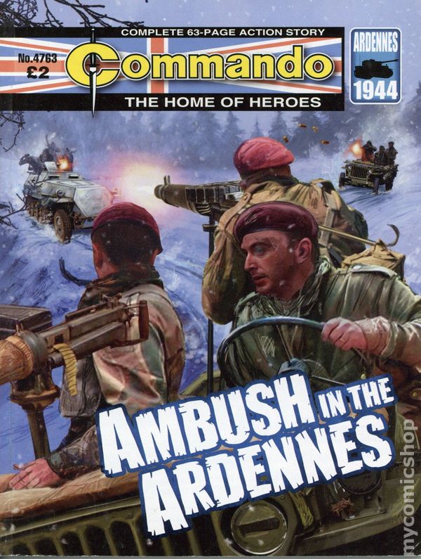 Ambush in the Ardennes - Written by Ferg Handley. Art by Rezzonico. Cover by Janek Matysiak. When Lieutenant Alexandre "Lex" Mertens joined a Belgian Special Forces unit late in World War II, he knew he'd be in for a tough time -- hit-and-run raids in heavily-armed jeeps were never going to be easy. What he didn't expect was to be called on to defend a village full of civilians from rampaging German forces and to have to take command of his new comrades. He didn't know if he'd be up to the job but for the sake of the civilians and his own men, he was going to have to be. Weekly British War comics digest. Softcover, 5 1/2-in. x 6 1/2-in., 68 pages, B&W.