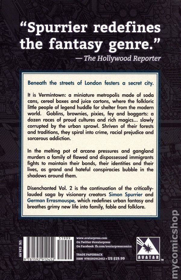 Volume 2 - 1st printing. Written by Simon Spurrier. Art and cover by German Erramouspe. Violence, crime, drug use, and racism rule on the streets of Vermintown. SIMON SPURRIER has created a fascinating city of angry fairy folk that have become far too much like the human race that no longer believes in them. The smash-hit web comic takes you into a metropolis of vices that unflinchingly shows us what happened to the fairy folk of yesteryear. Now this living and breathing city holds a darkness that has rotted it to the core. Vermintown is where magic went to die. And in its streets the worst evils in us are now poisoning the last remaining magics in the world. Disenchanted will change the way you look at fairy tales forever. This volume collects the complete second arc of the weekly web series www.disenchantedcomic.com. Softcover, 144 pages, full color. Mature Readers Cover price $19.99.