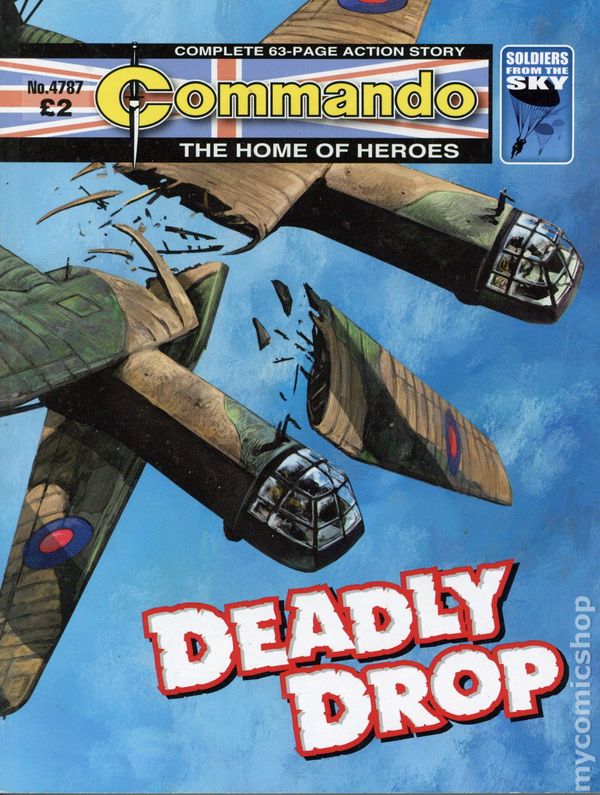 Deadly Drop - Written by George Low. Art by Olivera. Cover by Janek Matysiak. After a "friendly fire" incident cost the lives of his comrades, Private Ron Allan clashed violently with a fellow paratrooper, Corporal Alec Brown, the man he held responsible. Tensions were still high between them when, en route to a drop zone, history repeated itself. Alec's Horsa glider smashed into Ron's, sending both spiraling downwards. Alec's life was now in as much danger from his supposed colleague as it was from the Germans -- provided they both survived the drop to the hungry sea below. Weekly British War comics digest. Softcover, 5 1/2-in. x 6 1/2-in., 68 pages, B&W.