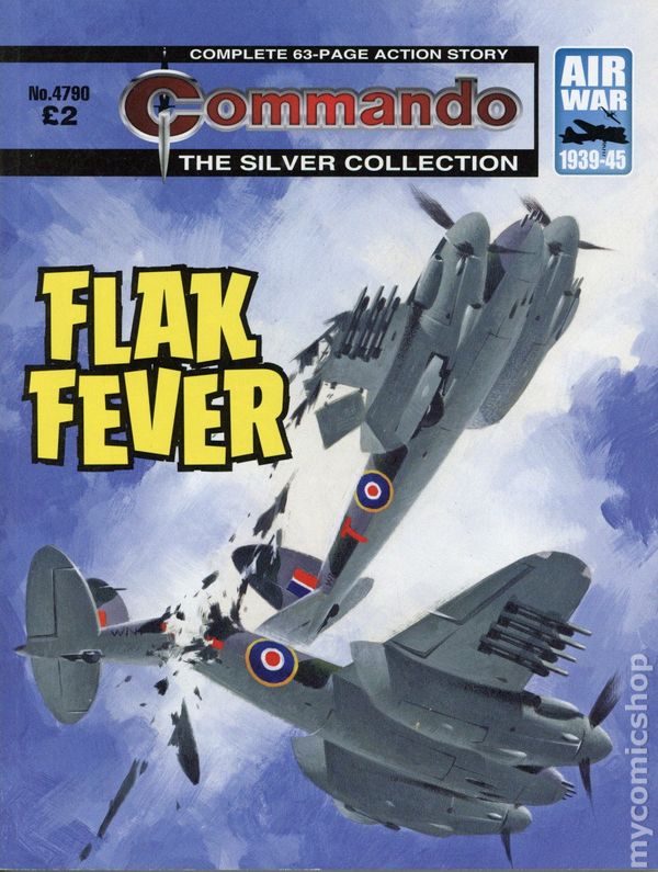 Reprinting Commando War Stories in Pictures (1961 D. C. Thomson Digest) #1102: Flak Fever - Written by R.A. Montague. Art by Gordon Livingstone. Cover by Ian Kennedy. Flieger Abwehr Kanone -- a German mouthful that was shortened to "flak," a word dreaded by every Allied pilot. It meant anti-aircraft guns, those multi-barrelled cannon and deadly 88-millimetre guns that could blast attackers out of the sky. Every important target in Nazi Europe bristled with them. Mosquito pilot Terry Franklin had met his fair share of flak and it terrified him. Yet here he was in a new squadron whose job it was to attack only the most difficult targets! Weekly British War comics digest. Softcover, 5 1/2-in. x 6 1/2-in., 68 pages, B&W.