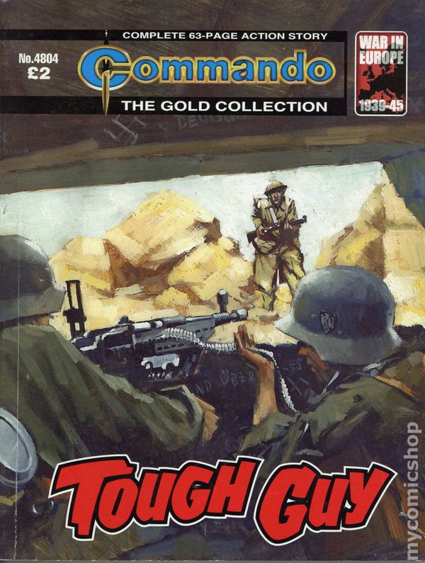 Reprinting Commando War Stories in Pictures (1961 D. C. Thomson Digest) #149: Tough Guy - Written by Jim Kenner. Art by Victor de la Fuente. Cover by Scholler. Joe Brady was as tough as the Liverpool slums that had bred him -- and boy, he could hate! The many Nazis he met knew the cold ferocity which blazed in his eyes as he swept into battle, but they could tell no one. For dead men tell no tales. Weekly British War comics digest. Softcover, 5 1/2-in. x 6 1/2-in., 68 pages, B&W.