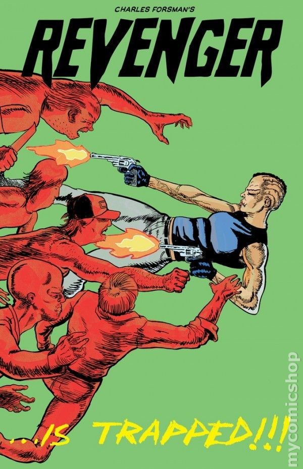 "...Is Trapped!! - Written and illustrated by Charles Sanford Forsman. Revenger travels a broken United States helping the weak and exploited through the use of extreme violence. When all else fails, Revenger evens the score. 6 5/8" x 10 1/4", 44 pages, full color, Mature Readers. Cover price $8.00.