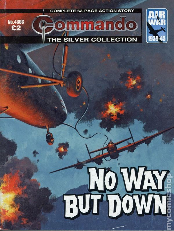 Reprinting Commando War Stories in Pictures (1961 D. C. Thomson Digest) #1052: No Way but Down - Written by McLean. Art by Gordon Livingstone. Cover by Ian Kennedy. If you're an army glider pilot, you've got a dodgy job -- landing yourself and your troops in the teeth of anything the enemy throws at you. Hazardous at the best of times, it's grimly suicidal when thick flak is coming up, the exploding shells chucking your frail Horsa all over the sky. If an unlucky burst cuts your tow-rope long before you reach your landing ground, there's only one way to go -- down...and fast! Weekly British War comics digest. Softcover, 5 1/2-in. x 6 1/2-in., 68 pages, B&W.