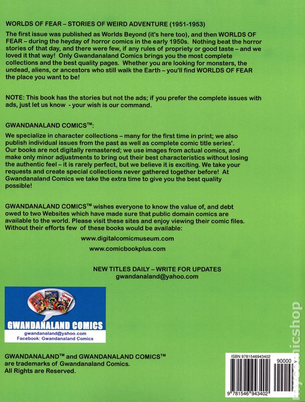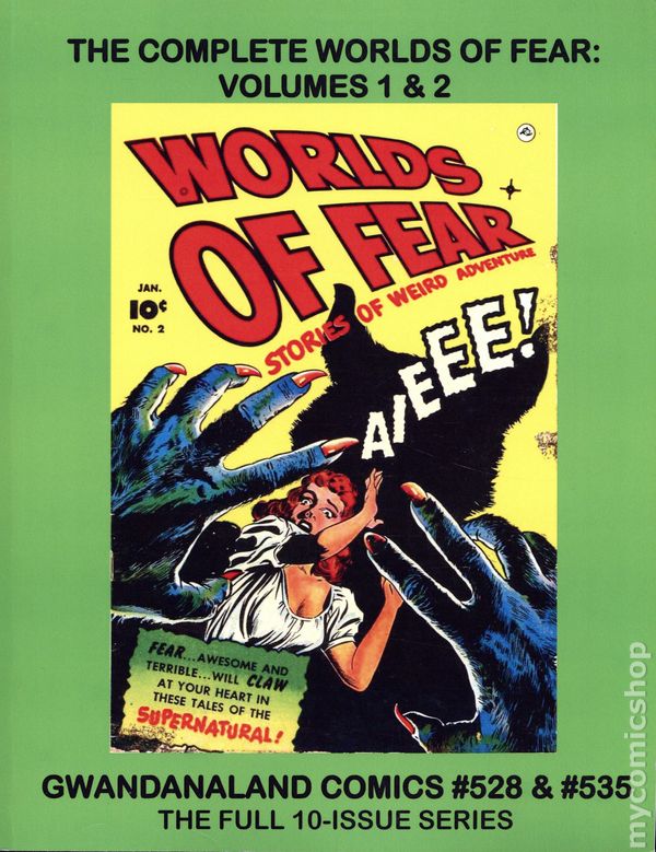 Volume 528/535 - 1st Printing. "The Complete Worlds of Fear!" Collects Worlds Beyond (1951) #1, and Worlds of Fear (1952) #2-10. These budget friendly reprints of classic western sci-fi, horror, and adventure comics feature some of the best in public domain comic book reprints. Softcover, 8 1/2-in. x 11-in., 270 pages, full color.