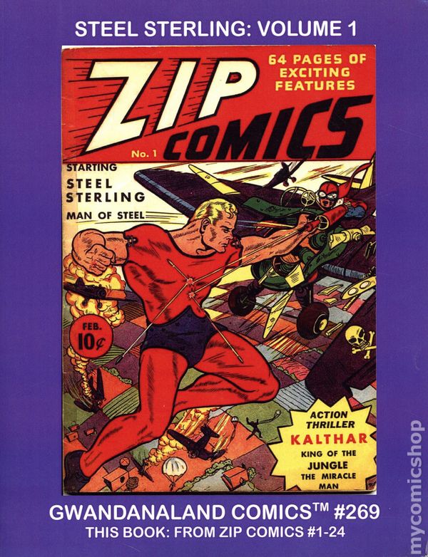 Volume 269 - 1st Printing. "Steel Sterling Volume 1!" Collects material from Zip Comics (1940) #1-24. These budget friendly reprints of classic western sci-fi, horror, and adventure comics feature some of the best in public domain comic book reprints. Softcover, 8 1/2-in. x 11-in., 356 pages, full color.